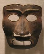 "War Mask Mongolian or Tibetan, 12th-14th century ... Masks from Tibet and Mongolia for use in ritual dances and other ceremonies are relatively common and were made from papier-mâché, leather, or gilt copper. This mask, however, is exceptionally rare because it is a war mask rather than a ritual mask and is made of iron. It is one of only two known masks of this type with distinctly Mongolian or Tibetan features. Bronze and silver war masks were used during the Roman Empire and in the Ancient Near East. We know of iron war masks from southern Ukraine and Russia (10th-13th century), from Iran (13th-16th century), and from Japan, where they were worn by Samurai warriors (15th-19th century). This example provides a unique Centural Asian link in the use of war masks from the western steppes of Europe to the eastern edges of Asia." ...