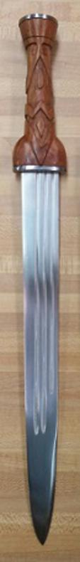 "Do mieczy użyawanych przez kilka stuleci należy także dwuręczny miecz z okresu starożytnej Szkocji. Był to poprzednik znanego miecza claymore rozpowszechnionego w XV i SVI wieku. Nazwa ta powstała od galijskiego claidheamh mór -- wielki miecz. Miał on długą szeroką głownię i wydłużoną rękojeść ze stosunkowo małą głowicą. Raimona prostego jelca skierowane były w kierunku głowni. Jego końce miały ozdobę w kształcie kwadratowych krążków, służących wyłaywaniu ciosów przeciwnika. Ze środka jelca wyprowadzony był na głownię kolec, którego koniec po połączeniu a obydwoma końcami jelca tworzył romb."