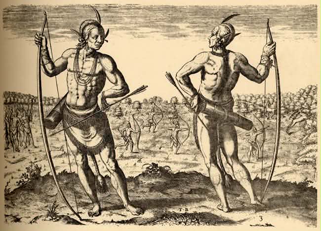 "Some of the earliest illustrations (c.1585) by John White of the Indians of present-day North Carolina and Virginia, show bows which, at a conservative estimate, were 5 feet 6 inches to 6 feet (1.7m to 1.8m) in length. Of relatively simple construction and resembling the English longbow, they were undoubtedly of a style which extended back at least a further 500 years."
