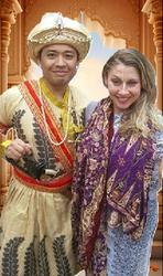"The Rajah of Tanjore in the Karnataka, a member of the Mahrat caste and an adherent of Vishnu. His turban is made of embroidered silk and is decorated at the front with a brooch holding an eagle's feather in place. He is wearing diamond earrings, a white muslin robe, a cashmere belt and a plaited shoulder belt."