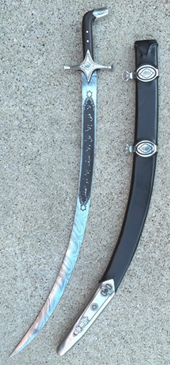 "Apart from scimitars, double-edged swords called quaddare were also used in Persia. ... [One type] had a flat blade, was often decorated with an acid etched letter ornament and had a symmetrical, metal hilt with a small pommel. The quillon ends were curved in the blade's direction."