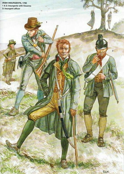 "Formed in 1791, this 'left-wing' organization was pledged to a total overthrow of the existing regime and to the establishment of a French-style republic dedicated to Liberty, Equality and the Rights of Man. 'The 98' is popularly characterized in the conventional terms of a Catholic peasant uprising against the Protestant ascendancy, but it is important to remember that many of its radical leaders -- such as Lord Edward Fitzgerald, Wolfe Tone and Bagenal Harvey -- were Protestants, who regarded religion as an issue only insofar as they wanted to end the entrenched discrimination against Catholics in public life. However, it was only making common cause with the landless Catholic peasantry that they were able -- on paper at least -- to form a large army, which was intended to rise up in concert with a French invasion."