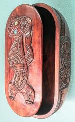 "Some wakahuia were of a canoe hull form with tiki heads projecting out from each end, similar to the heads seen on the prows of certain canoes. The 'bodies' of these heads were, in some designs, placed on the underside of the box."