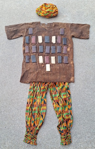 "A short prayer, a verse from the Koran, or magic square is commonly written on paper, folded, and tucked inside the amulets. Blacksmiths and Muslim teachers (mallam) choose the inscription to be sealed in secrecy. The notion of writing as an act of recording words for others to consult openly is thereby reversed. Encased in leather, fur, or fiber, the amulets may also enclose the words and prayers uttered by the mallam. Asante chiefs and senior officials did not wear these shirts to hunt; instead, they wore them into battle as protection or during installations of leaders to announce that they were prepared for warfare."